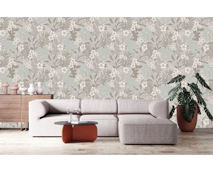 Фоновые обои нельзя обозначить как какой-то конкретный узор. Здесь можно увидеть и хаотичное движение холодных потоков воды, и срезы камня, и очертания скалистых берегов, и плотный туман на рассвете. На таком сложном базовом рисунке на декоративных полотнах добавлены ветки растений. Сами флористические элементы двух цветов, но с добавлением минимального количества серебряных блесток. Такой сложный минимализм, при правильном подборе мебели и акцентных аксессуаров, может создать интерьер в стиле не только модерн, но и романтизма.